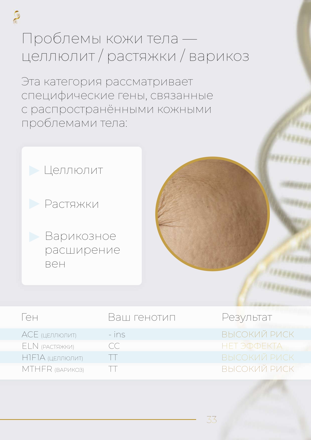 +7 (812) 426-19-14ДНК-тест Skin Care (генетика красоты) помогает понять, как именно ваши гены влияют на состояние кожи и волос. Это не медицинский диагноз, а персонализированный генетический отчёт, который показывает врождённые особенности организма и даёт рекомендации по уходу.